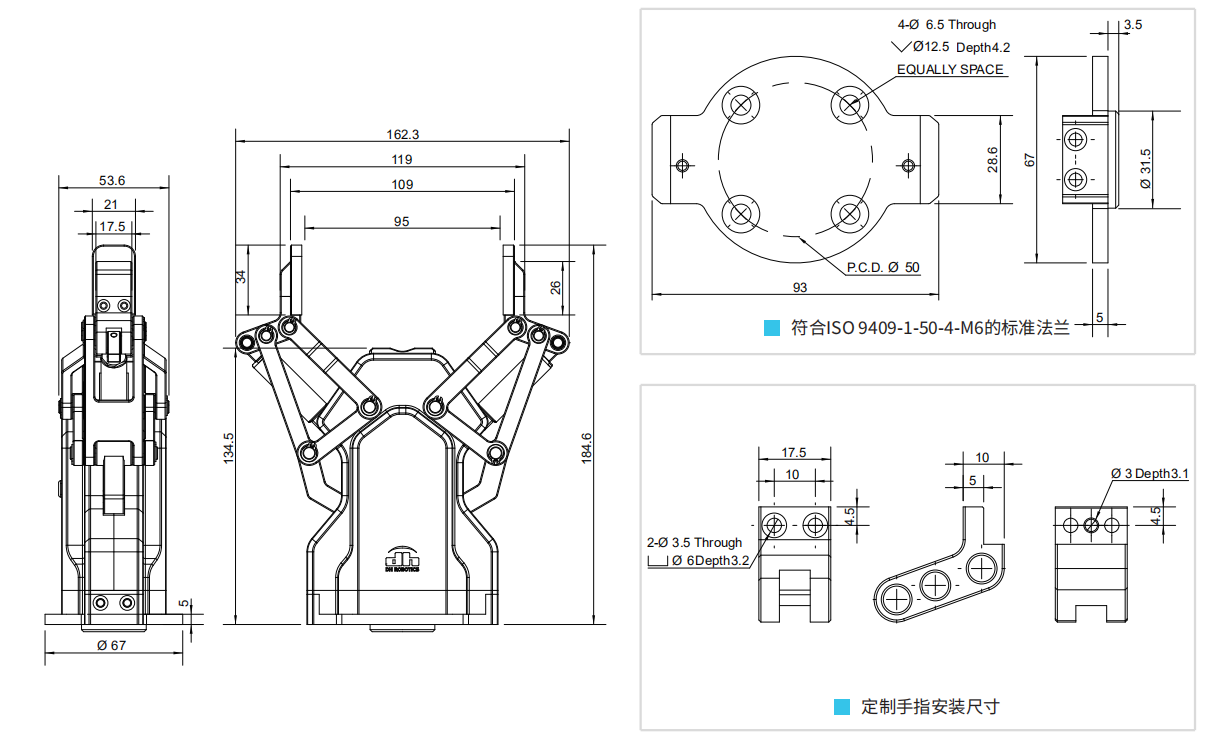 5. 一體化設(shè)計(jì)集成:夾爪一體化集成電機(jī)、連桿機(jī)構(gòu)、驅(qū)動(dòng)控制系統(tǒng),結(jié)構(gòu)緊湊體積小,防護(hù)等級(jí)高。