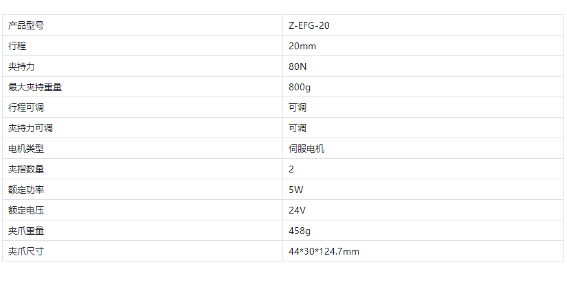答:可以,20mm 都是指有效行程,而非被夾取物體的尺寸,被夾取對象最大到最小的尺寸差在 20mm 之內(nèi)的,都可以用 Z-EFG-20 來夾取。