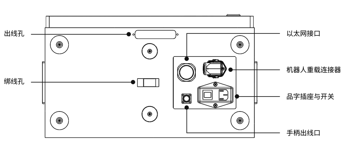 電控柜底面板包括出線孔、綁線孔、手柄出線口,以及以太網(wǎng)接口、機(jī)器人重載連接器、品字插座與開(kāi)關(guān)等,其中出線孔和綁線孔可用于布置和固定通往機(jī)器人前面板的線束。以太網(wǎng)接口用于將機(jī)器人連接至本地網(wǎng)絡(luò)。品字插頭與開(kāi)關(guān)用于電源連接,機(jī)器人重載連接器用于連接電控柜與機(jī)器人本體。