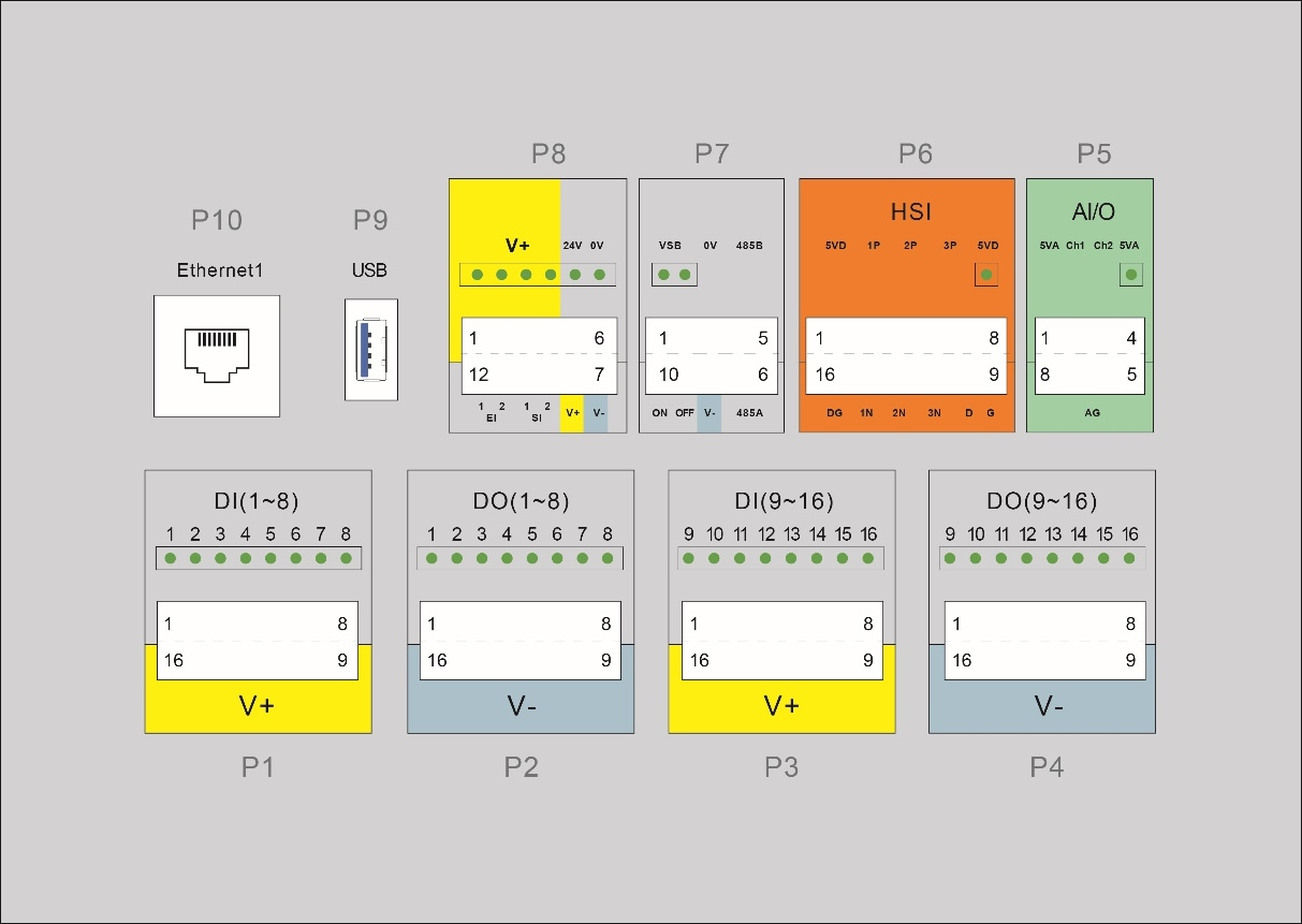電控柜前面板接口布置在電控柜門(mén)打開(kāi)后的第一層,包括 16 個(gè)數(shù)字輸入(P1 與 P3)、16 個(gè)數(shù)字輸出(P2與 P4)、兩個(gè)可配置模擬量接口(P5)、一組高速接口(P6)、遠(yuǎn)程開(kāi)關(guān)機(jī)與 485 接口(P7)、安全功能(P8)、USB3.0 接口(P9)與以太網(wǎng)接口(P10),USB 接口與以太網(wǎng)接口保留為內(nèi)部使用。