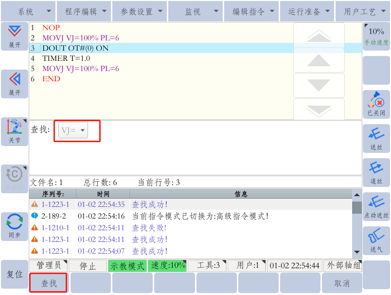 點擊“查找”,彈出查找界?,查找的選項均為各指令的附加項(指令的普通模 式和?級模式顯示的選項數(shù)量不?樣),選擇需要查找的選項,輸?相應(yīng)的數(shù)值后,點擊?菜單欄的“查找”即可在當(dāng)前程序內(nèi)查找符合要求的程序,光標(biāo)或?動切換到符合要求的程序?。