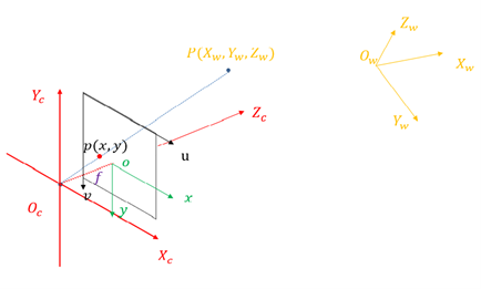 對(duì)于任何物體的衡量都是相對(duì)的,都需要選擇一個(gè)基準(zhǔn),因此建立世界坐標(biāo)系(OW-XWYWZW)來(lái)衡量空間中攝像機(jī)和目標(biāo)物體的空間位置是不可或缺的。因?yàn)槭澜缱鴺?biāo)系是變化的,故想要直接確定圖像平面與世界坐標(biāo)系之間的相對(duì)位姿關(guān)系是困難的。