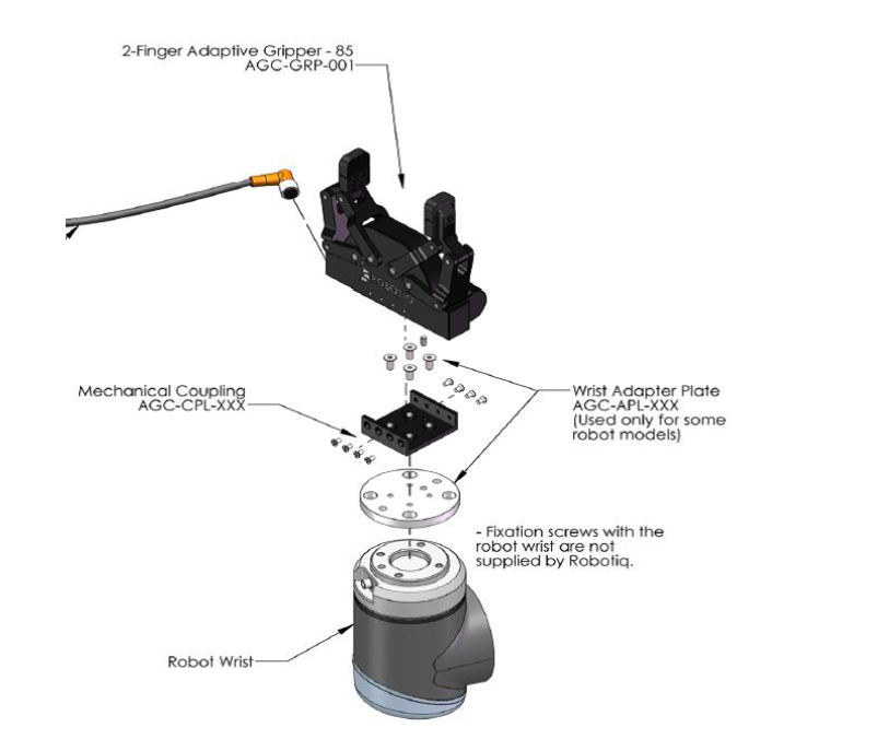 Robotiq夾爪通過腕部轉接板安裝在UR機械臂上,以下是安裝示意圖。