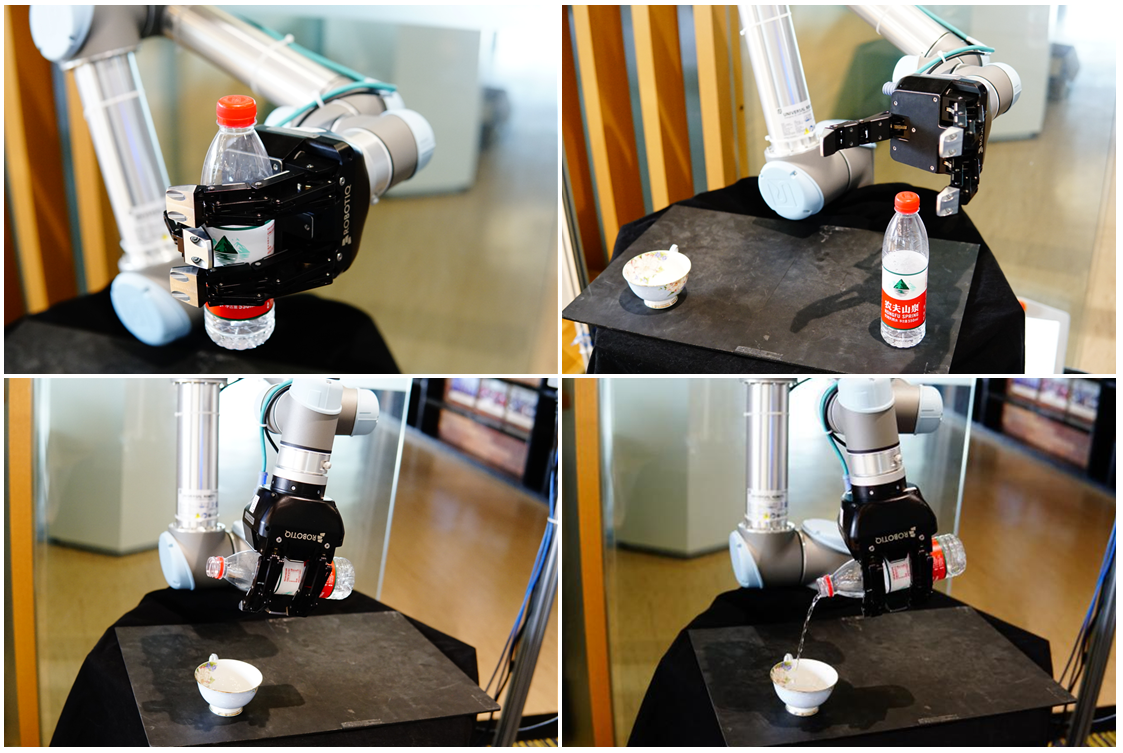 UR機器人上之后,可以抓取礦泉水瓶并將水倒進杯子中。相信不久的將來,UR機器人將協助人類做很多意向不到的事情。