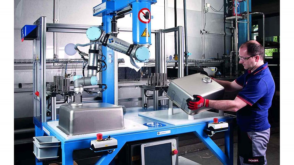 例如,總部位于俄亥俄州的制造商蒂森克虜伯-比爾斯坦(thyssenkrupp-Bilstein)成功地將UR10應用于檢查汽車懸架零件。制造工程師道格·麥基(Doug McIe)說:“以前我們進行儀表檢查時,我們會每一兩個小時檢查兩個零件,以確保我們仍在原來的位置,但現在我們有了100%的檢查。”最終裝配中部署的UR10機器人配備有三維機器視覺設備,并在檢查點之間快速移動,以確保所有部件處于正確位置,標簽正確應用且可讀。“每一個零件都會被檢查,如果它偏移了正確位置,機器人會在這個過程中找到它,”McIe解釋道。