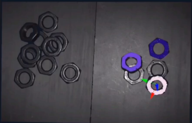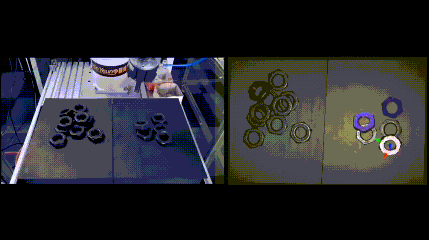 顯揚科技的3D相機HY-M5首先對產(chǎn)品進行拍攝三維點云,通過HYPick軟件對產(chǎn)品進行分析定位,將產(chǎn)品的坐標(biāo)數(shù)據(jù)發(fā)送到機器人上。由3D視覺系統(tǒng)引導(dǎo)機器人準(zhǔn)確地抓取螺母,并將其放置在需要的位置。顯揚科技的3D相機不僅可以對不同大小的螺母識別抓取,還可以對雜亂無章的螺母進行準(zhǔn)確分揀。