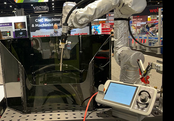ABB的新GoFa合作機器人,用于焊接。GoFa的設計使客戶無需依賴機器人編程專家。這將幫助最終用戶能夠在安裝后幾分鐘內直接操作機器人,無需專門培訓。參觀展臺的觀眾可以通過編程功能使用ABB可定制的雙按鈕引線。通過將機器人移動到所需的焊接路徑,訪客將創建自己的焊接程序,并觀看GoFa復制該路徑。