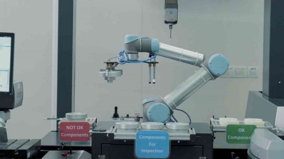 一臺UR5機器人整合三種測量技術:三坐標測量機,仿形機床和一臺非接觸式測量機協作式機器人根據相關程序掃描每個組件的條碼,將其放置到每臺機器上檢查。檢查后,測量機向協作式機器人發送組件是否可用的信息。協作式機器人據此依次分揀零件,將零件放置在“合規”或“不合格”的箱子中。