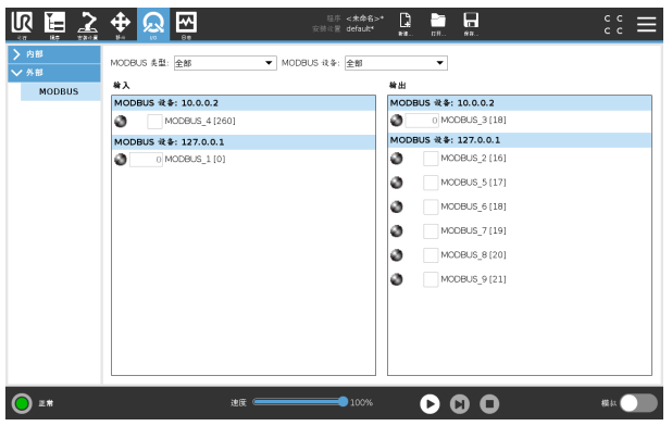 下面的截屏顯示了在安裝中設(shè)置的MODBUS客戶端I/O信號。如果設(shè)置的數(shù)量不止一個,使用頁面頂部的下拉菜單可以根據(jù)信號類型和MODBUS單元更改顯示的內(nèi)容。列表中的每一個信號都包含連接狀態(tài)、數(shù)值、名稱和信號地址。如果連接狀態(tài)和I/O選項卡的控制選擇允許,輸出信號可以切換。
