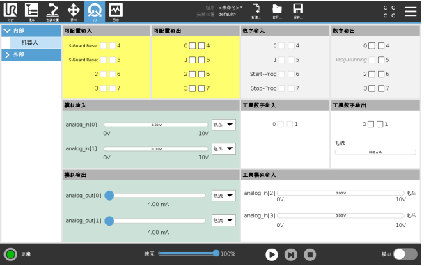 模擬I/O可設(shè)置為電流[4-20mA]輸出或電壓[0-10V]輸出。保存程序時,系統(tǒng)將記住該設(shè)置,以便在后續(xù)重新啟動UR機器人控制器時使用。在工具輸出中,選擇URCap會刪除對模擬工具輸入域設(shè)置的訪問。