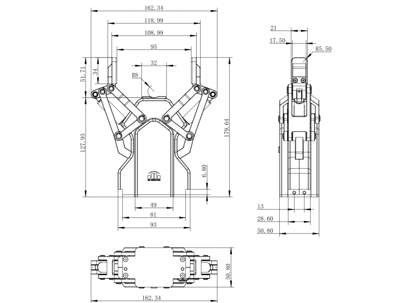 夾爪本體內嵌有 modbus-RTU 協議及 IO 模式進行控制,無需任何驅動器及伺服器。當以上兩種協議不能滿足項目需求,您可以使用通訊協議轉換器將其他通訊協議(USB、TCP/IP、MODBUS TCP、CAN2.0 等)轉換到 485 模式,從而支持不同的控制器(PC/PLC/機器人)連接。