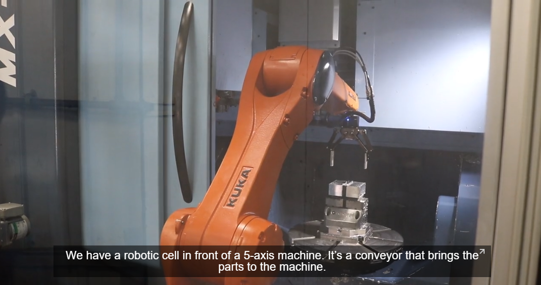 Précinov 在他們的 5 軸 CNC 機床前安裝了一個機器人單元。機器人將零件放在傳送帶上并將其放入機器中。如果需要,它可以翻轉(zhuǎn)零件,并在加工結(jié)束時將其取出。它基本上完成操作員的工作,而 Précinov 則聘請有資格從事完整生產(chǎn)設(shè)置的機械師。