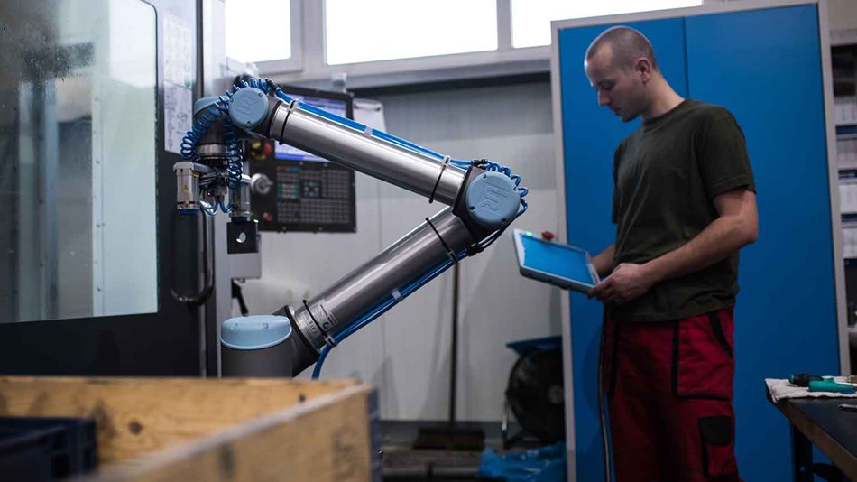 有了UR 協(xié)作機(jī)器人的加入,員工再也不用守在數(shù)控機(jī)床的旁邊,也不需要設(shè)置圍欄等其他安全措施。他們只需向容器中裝入夠數(shù)小時(shí)使用的零件,然后隨機(jī)檢查任務(wù)狀態(tài)即可。