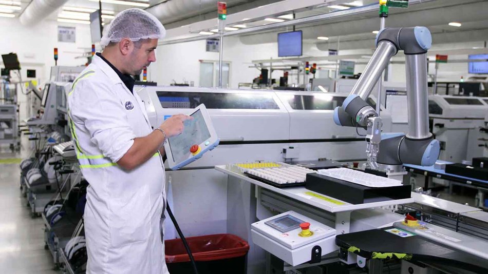 公司目前使用四個優傲協作式機器人將引入部件安裝到電路板中,由于封裝或部件本身的尺寸較大,傳統的自動機器無法操作這些部件;而 UR10、UR5和UR5e 協作式機器人可以利用經認證的 OnRobot UR+ RG2 協作式夾具實現這一操作 -直接從供應商包裝中拾取單個部件,例如接頭或引入部件。然后將部件安裝到傳送帶上的電路板上,傳送帶也是生產線的一部分。