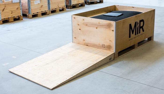 1. 將帶有機器人的包裝箱放置到位,使包裝箱前后均留有3 米的自由空間。由于機器人要在斜坡上從包裝箱中取出來,因此上述操作很有必要。