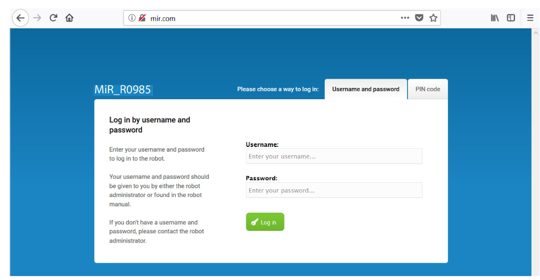 MiR機器人WiFi接入點和訪問網(wǎng)絡界面的用戶名和密碼位于MiR 用戶名和密碼文檔中。包裝箱內(nèi)包括該文檔與機器人。