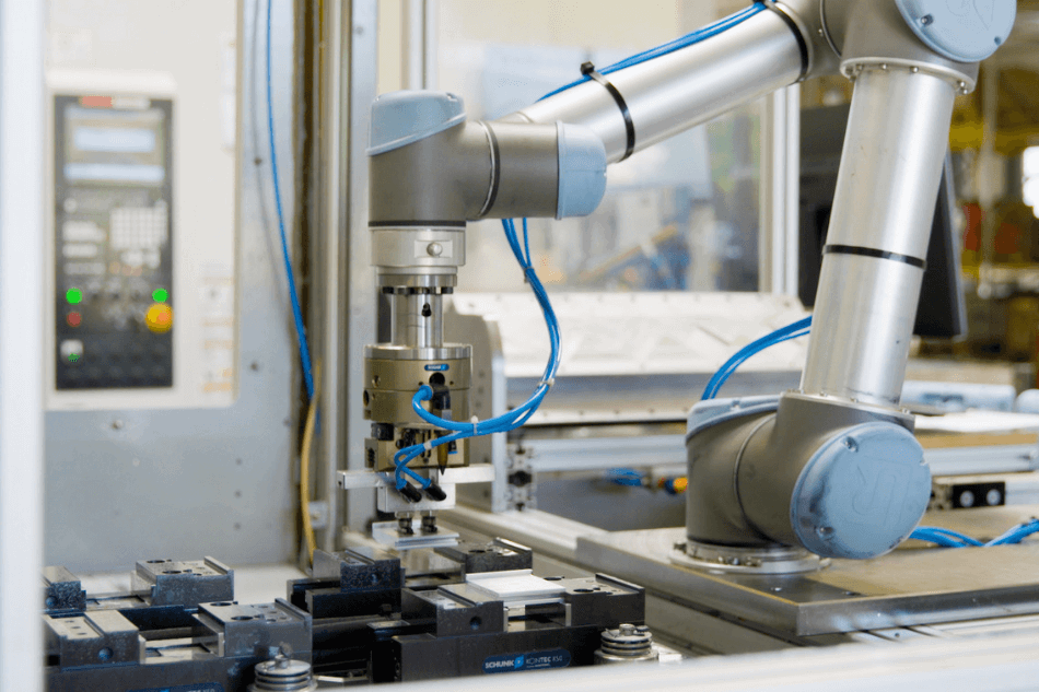 來自Universal Robots的兩個協(xié)作機器人從包裝箱中挑選了隨機定向的零件并送入CNC銑床,從而提供了零缺陷生產(chǎn)。