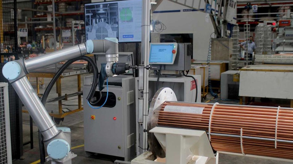 L公司部署了UR10協(xié)作機器人來處理銅管擴展任務。攝像機與視覺系統(tǒng)集成在一起,拍攝了管殼式熱交換器的照片,并檢測了銅管的輪廓。還對協(xié)作機器人進行了編程,使其每5個循環(huán)將擴展工具浸入清潔劑和潤滑劑中一次。