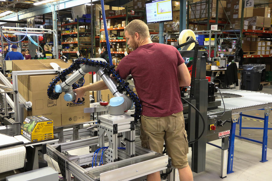 在選擇通用機器人的UR5機器人用于立例應用之前,該公司考慮使用更傳統(tǒng)的機械外殼直立器。"但是,他們做什么是有限的,他們只處理一定范圍的案件。我們希望有更大的靈活性,"Griffin 說,他解釋說,將箱子折疊成形狀并在其中添加產品是一項快節(jié)奏的任務,員工長時間不喜歡這樣做。"雖然我們的許多產品都是四包,但有些是單包裝,我們對某些客戶進行特殊包裝。例如,亞馬遜要求我們的許多磨刀放在一個可裝的集裝箱里[自有集裝箱(SIOC)],這樣他們就不必重新裝箱了。我們有很多不同的案例包裝配置,而且它們的數(shù)量也越來越多。