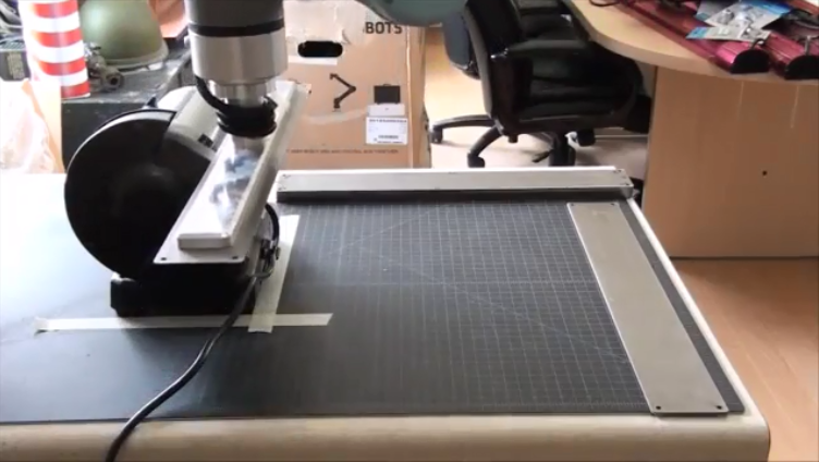 第二個(gè)演示中,輪式砂光機(jī)固定在工作臺(tái)上。UR10e機(jī)器人配備定制真空末端執(zhí)行器,一次拾取一個(gè)金屬板,并將該部件呈現(xiàn)給砂輪打磨機(jī)以去除外部輪廓。機(jī)器人能夠以相對(duì)于砂光機(jī)的恒定速度移動(dòng)零件。