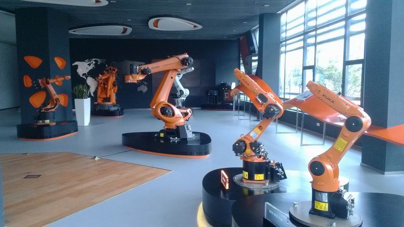KUKA車門點焊機器人將車門搬運至操作臺,隨即完成點焊。同時,美的庫卡展出“順德造”也成為展會亮點。