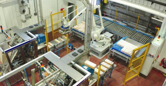 通過使用ABB robot studio,制造商也可以獲取更多的知識。他們決定使用定制夾持器,使ABB機器人能夠以所需速率將包裝堆疊到托盤上。