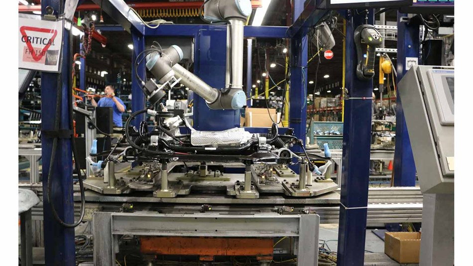 位于新西蘭的Betacom依靠UR10協(xié)作機器人生產(chǎn)LED路燈。生產(chǎn)這些燈對于確保道路上駕駛員的安全非常重要,并且需要高精度操作。UR10使用多頭真空夾持器從機架上拾取電路板,并將其放置在鋁壓機上。然后,機器人拾取六個LED透鏡并將它們定位到電路板上。最后拿起一把帶有自動送絲螺釘?shù)臍鈩勇萁z刀,將透鏡和電路板固定到鋁壓片上。